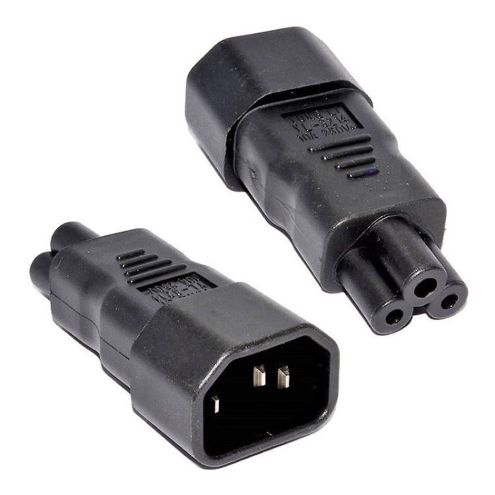Napájací adaptér v čiernom prevedení pre notebook, na vstupe konektor IEC C14 male a na výstupe „trojlístok“ alebo „Mickey mouse“ IEC C5 female.
