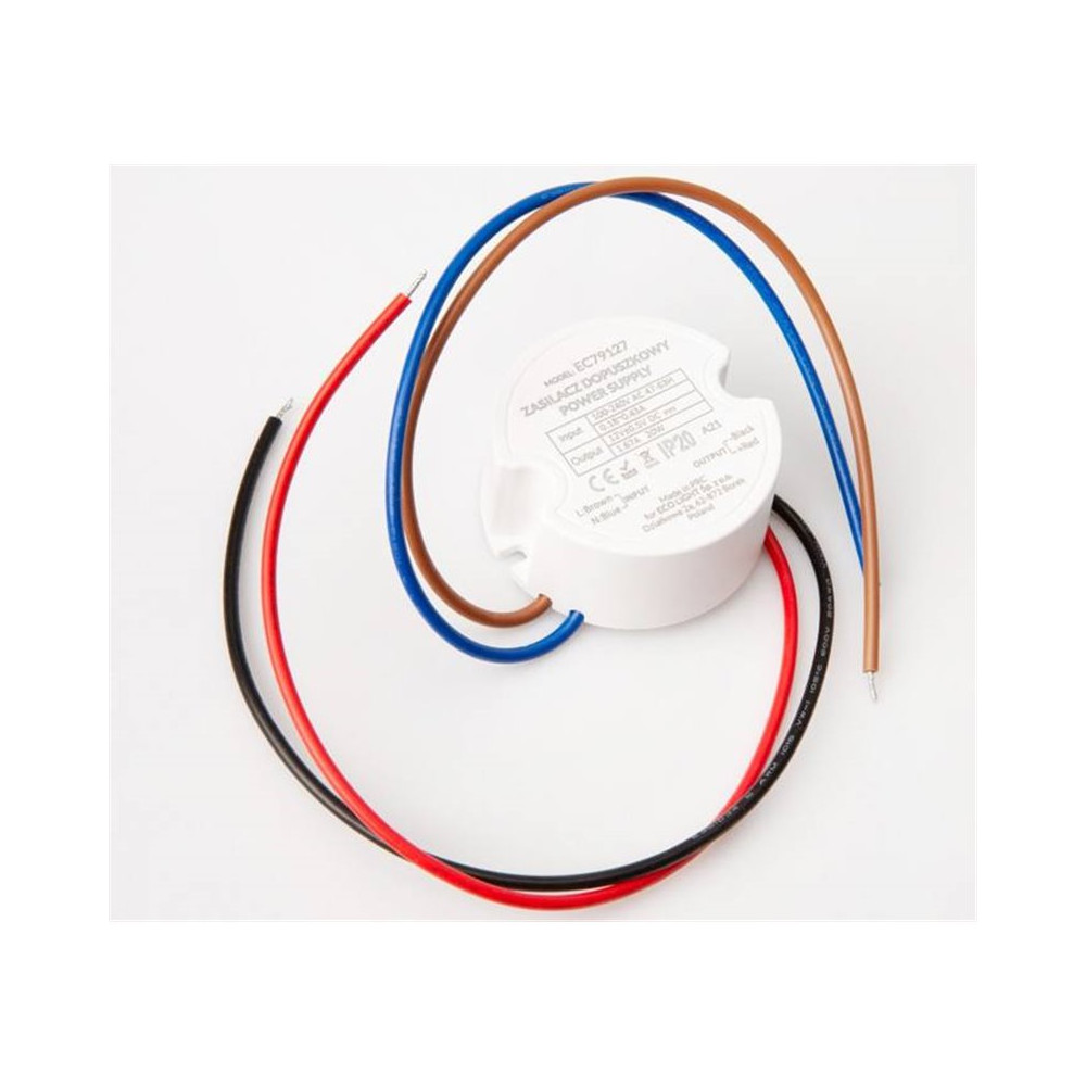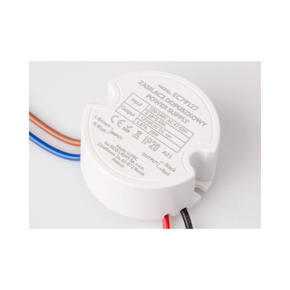 Kompaktný zápustný zdroj, slúžiaci na napájanie vnútorných LED inštalácií s napätím 12 V.Technické parametre:- Vstupné napätie . AC 100-240V, 47-63Hz, 0,18 ~ 0,43 A- Výstupné napätie DC 12V (± 0,5V), 1,67A- Maximálny výkon . 20 wattov- Krytie : IP20- Rozmery 48 x 22 mm (priemer x hrúbka)