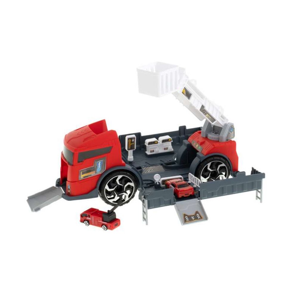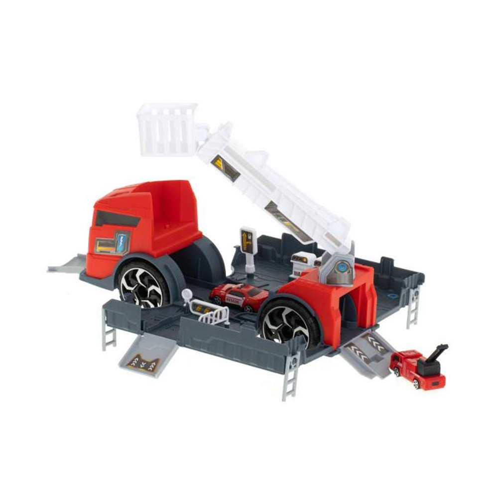 Hasičské auto, ktoré poslúži aj ako transport.Obsahuje pohyblivý rebrík a čerpaciu stanicu s dvoma výdajnými stojanmi.