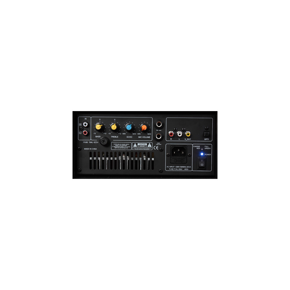 - Použitie – karaoke (spojte s TV cez video výstup), ozvučenie rečníkov, malý DJ set, fitness, tanec alebo pouličné vystúpenia.