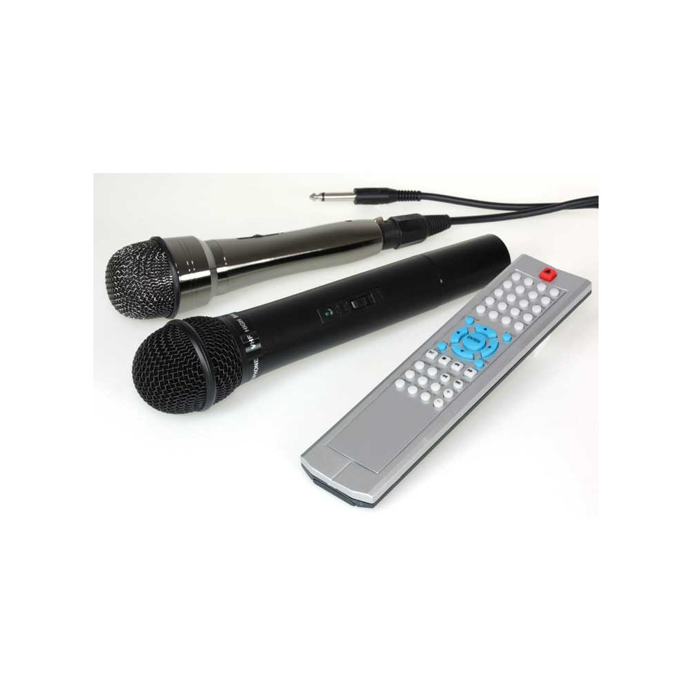 - VHF bezdrôtový mikrofón (207.5 MHz) + káblový MIC vstup – hands-free pohyb pri spievaní, echo efekt pre profesionálny karaoke zvuk.