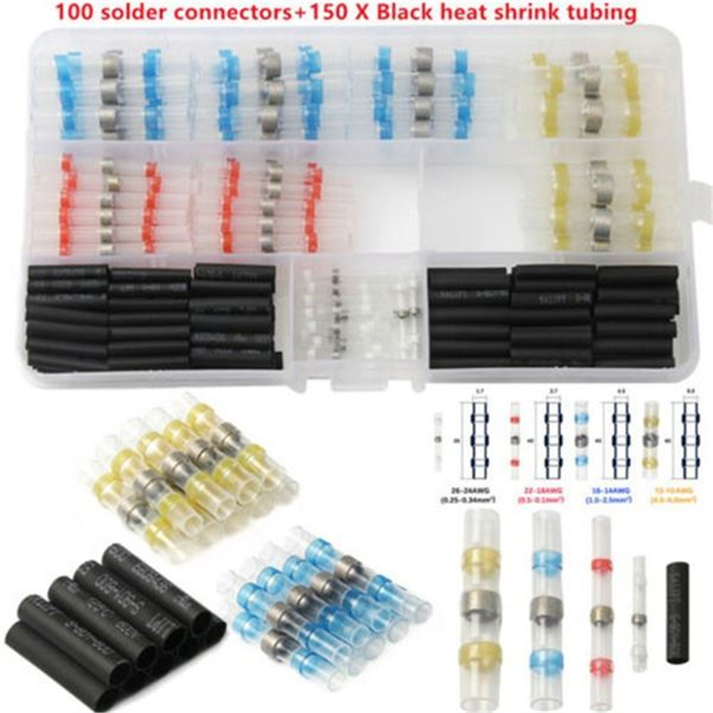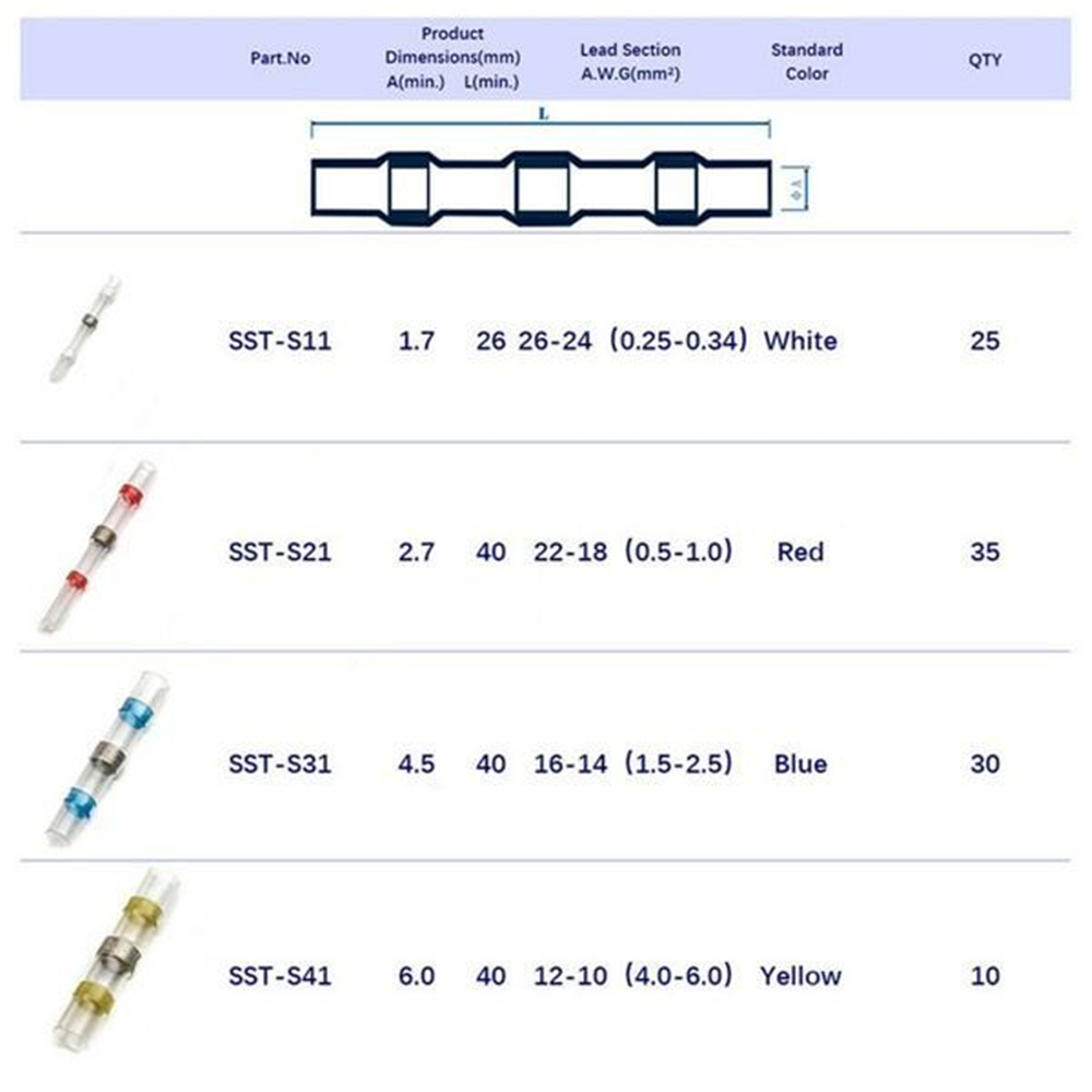 250ks káblových spojok s nízkoteplotnou SnBi spájkou a zmršťovacou bužírkou. Vhodné na spájanie automobilovej a inej kabeláže.