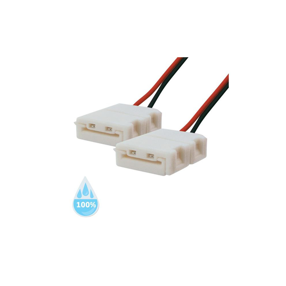 Napájacia dvojpinová spojka pre vodeodolné (IP68) LED pásky 5050, 5630 o šírke 10mm. Spojka slúži na prepojenie viacerých pásikov v sérii bez nutnosti spájkovania. Do konektora sa jednoducho nastrčí LED pásik tak, aby spájkovacie kontakty na pásku smerovali proti kovovým kontaktom v plaste a konektor uzavrieme.
